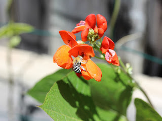 Blue banded bee, really loves the scarlet runners. Also have another small native bee buzz pollinating my tomatoes and eggplants.