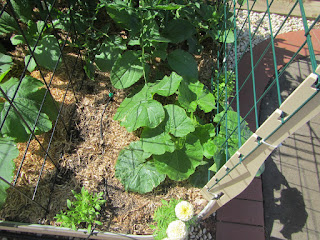 Cucumbers are smaller than in the other bed but doing okay now, no longer yellow. I'm sure they'll take off as they get more space/nutrients.